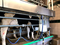 We left the chapel and by this time it was early evening. We decided to drive up to the dairy barns and as we passed, we could see they were herding in cows to be milked. We pulled into a parking area and asked a couple if we could go in to observe and they told us we could. This was quite the experience. Two young ladies were feeding the cows, washing their teats and hooking them up to an apparatus that milked them. It was fascinating to watch the milk circulate into the tubes and into a container. I asked how many gallons a cows gives in one day and was told around 10. They are milked once in the morning and again in the evening. I think Rylee enjoyed this as much as Lori and I did. We were also told that if we stuck around we could bottle feed the calves but by this time it was getting late and we had plans to meet up with Susie and Patsy for a show at the IMAX.